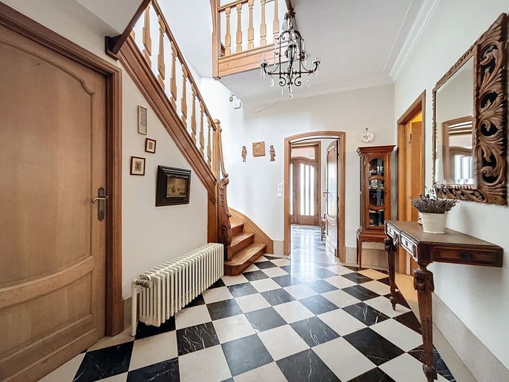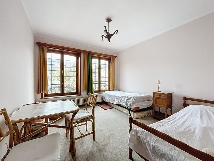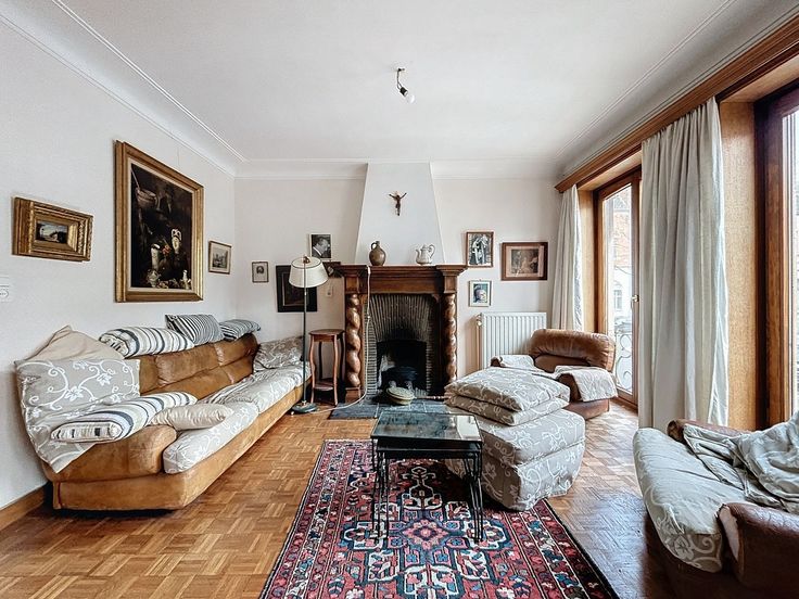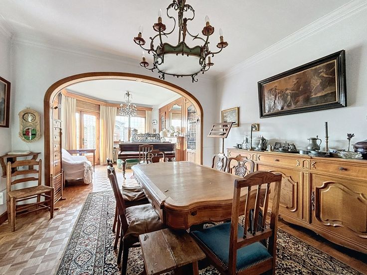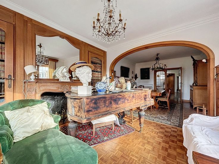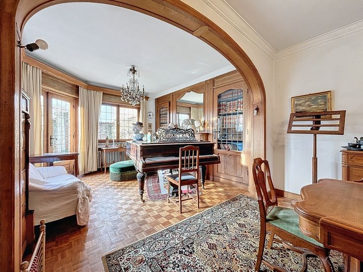 Cette maison de caractère, construite en 1955, est située sur un terrain d’environ 7 ares 35 centiares. Avec une surface habitable d’environ 260 m² et une surface bâtie totale d’environ 510 m², cette propriété se distingue par ses volumes généreux. Au rez-de-chaussée, un hall d’entrée spacieux, agrémenté de toilettes pour les invités, vous accueille. Ce hall dessert un bureau de ±17 m², idéal pour l’aménagement d’une profession libérale, ainsi que de vastes espaces de réception de ±42 m². Le salon, , bénéficie d’une belle luminosité naturelle . La salle à manger attenante est parfaite pour recevoir vos convives. La cuisine de ±14 m²dispose d’un coin repas pratique. Depuis ces pièces de vie, une grande terrasse s’ouvre sur un jardin arboré. Un spacieux garage pour deux voitures complète ce niveau. Le premier étage se compose d’un second salon spacieux de ±26,4 m², pouvant être aménagé en une ou deux chambres, ainsi que de deux chambres confortables de ±14 m² et ±10 m² et d’une salle de bains. Au dernier étage, trois autres chambres accueillantes ainsi qu’une deuxième salle de bains viennent compléter cet espace. Un grenier aménageable de ±60 m², accessible depuis cet étage, offre des possibilités de rangement supplémentaire ou d’aménagement selon vos besoins. Le sous-sol de la maison est tout aussi fonctionnel : plusieurs caves, local technique, buanderie. Cette maison dispose de matériaux de construction de qualité et allie charme, confort et praticité. Un bien à découvrir.