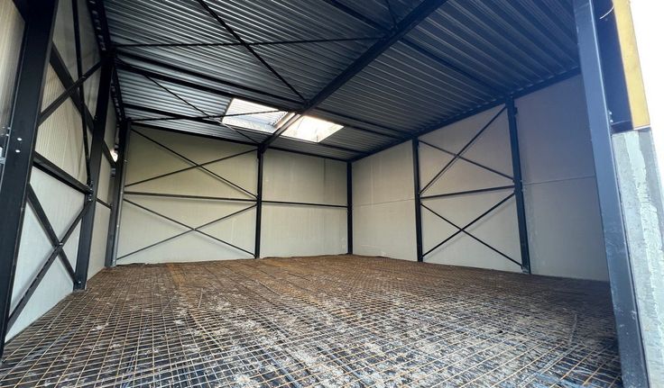 Specificaties: 1 automatische sectionale poort per unit 4m x 4m, 6m vrije hoogte, polybetonvloer (2T/m²), geïsoleerd steeldeck dak met lichtstraat, led-armaturen, afvoer sanitair, 32A, septische put 2000l en regenwaterput 3000l per unit, fietsenstalling met 2 laadpunten, 1 parking per unit met wachtbuis voor laadinfrastructuur, brandklasse C