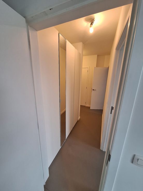 Modern appartment met 1 slaapkamer en tweede kamer die als buro of kleine slaapkamer kan dienen. Ruime living en modern ingerichte, open-concept keuken met aansluitend een grote berging. De slaapkamer en gang zijn voorzien van nieuwe, ruime kasten met praktische inrichting met lades en ophangruimte. Badkamer met 2 lavabos, bad-douche, en toegang tot een tweede ruime berging met aansluitingen voor wasmachine en droogkast.