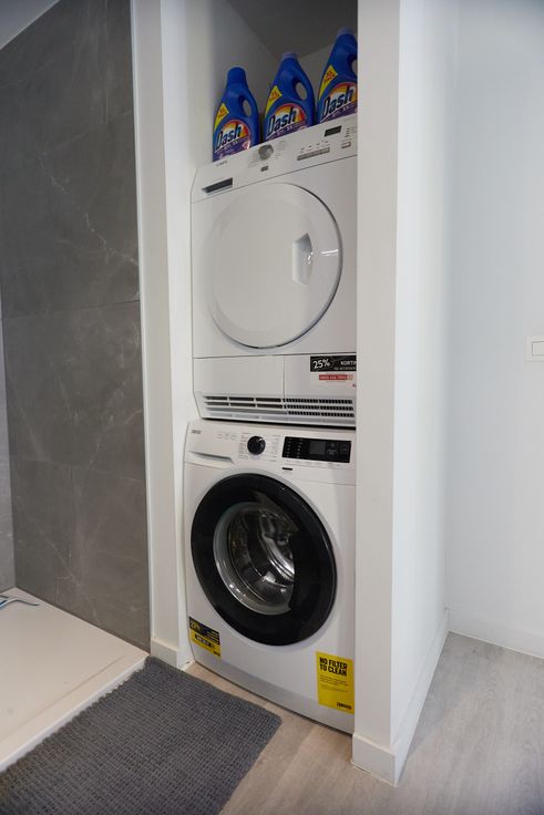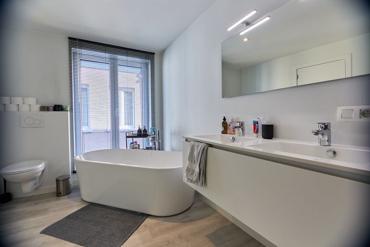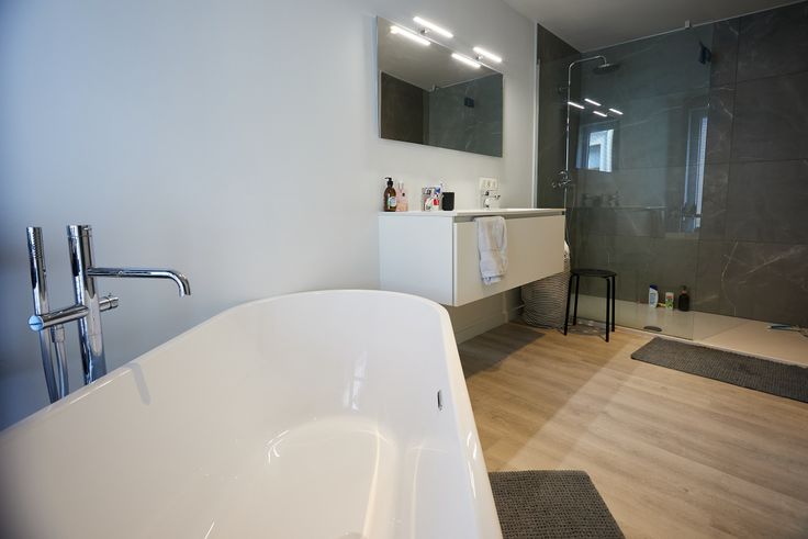 De prachtige badkamer is een echte eyecatcher, met een luxueus vrijstaand bad en een ruime inloopdouche – dé perfecte plek om te ontspannen na een lange dag. Daarnaast is er een praktische hoek voorzien voor je wasmachine en droogkast.