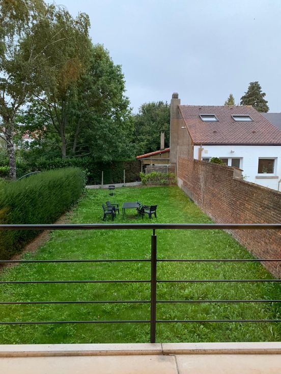 Vue arrière sur un jardin et une belle terrasse de 13m2 avec un meuble de rangement.