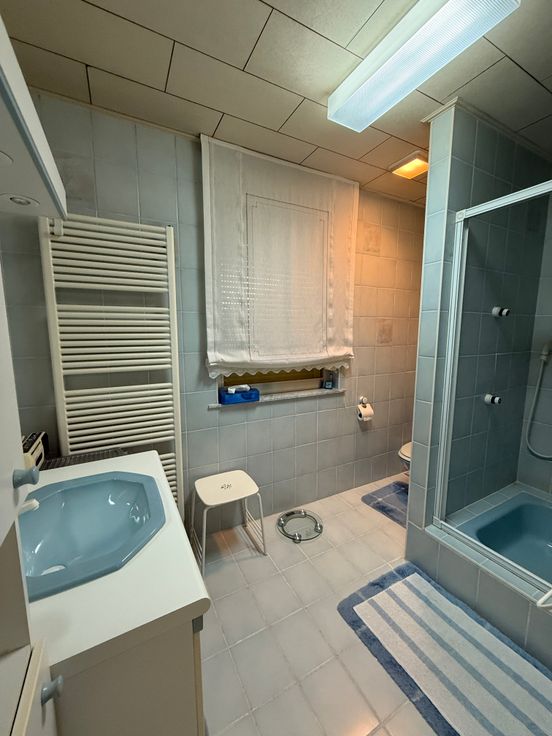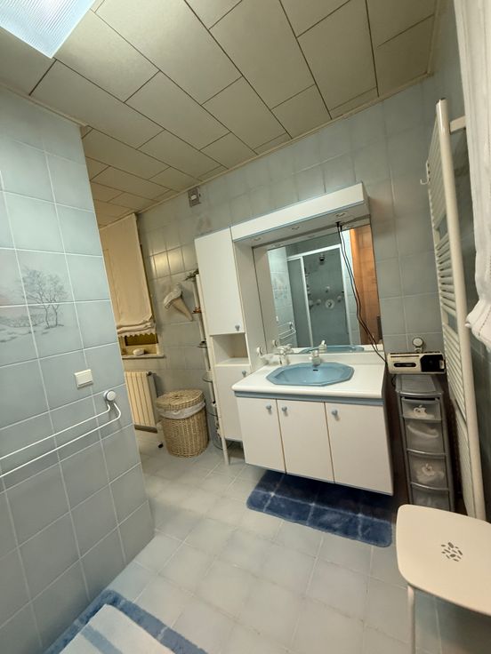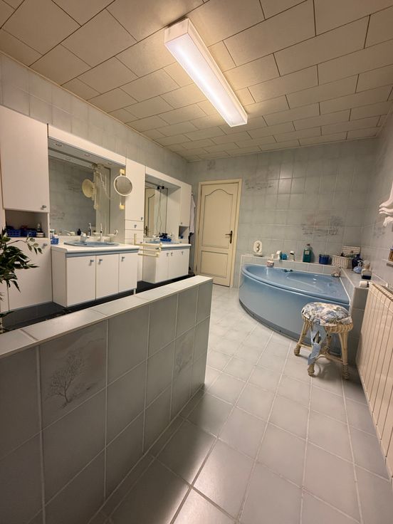 À l’entresol, une grande salle de bain vous attend, équipée d’une baignoire d’angle, d’une douche, d’un WC ainsi que d’un double évier offrant un confort optimal au quotidien.