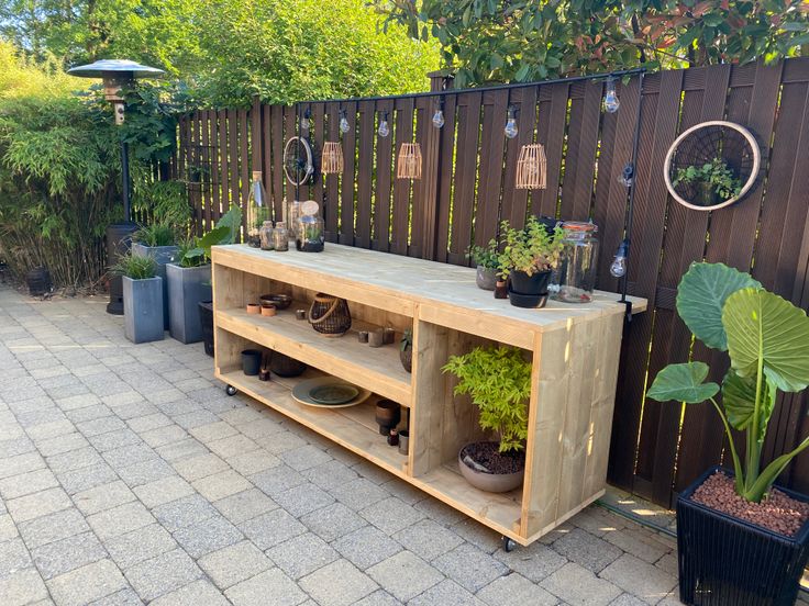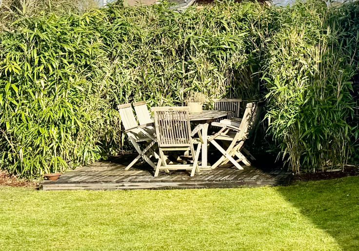 Bankirai-terras aan waterbekken, terras aan tuinhuis en terras tussen de bamboe