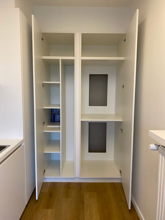 Keuken met ingebouwde oven, aparte microgolf, vaatwas, frigo met aparte diepvries, mogelijkheid tot aansluiting wasmachine en droogkast, uittrekbare keukenkraan en veel op maat gemaakte ingebouwde kastruimte.