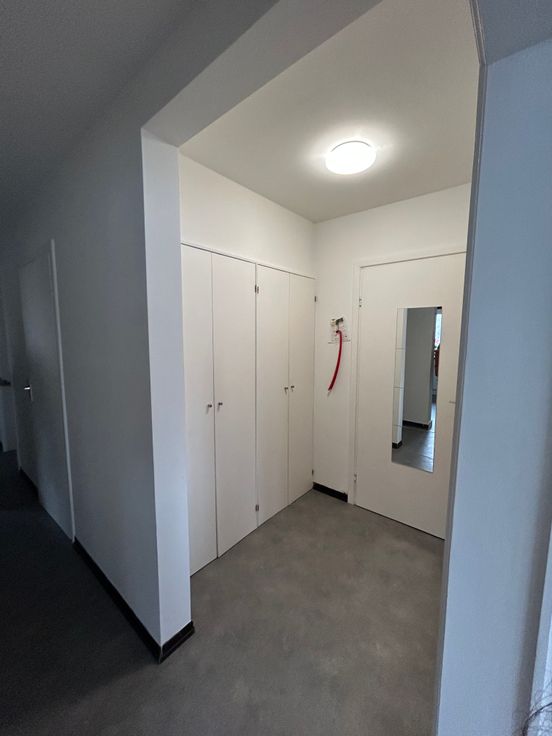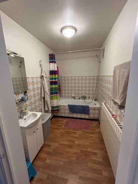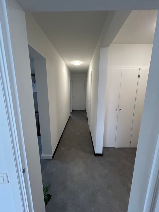 Een inkomhal, een lichte woonkamer, een half uitgeruste keuken (kookplaten, dampkap, spoelbak), 2 slaapkamers (14 m² en 10 m²), een badkamer met bad, een apart toilet, een kleine berging en een groot balkon.