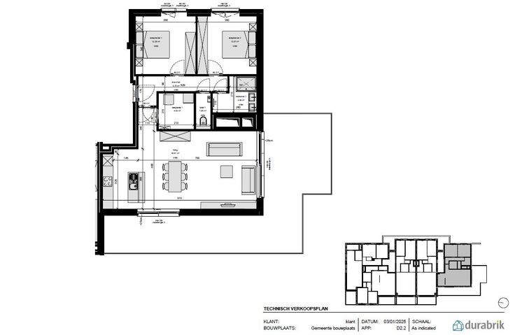 Met 32 exclusieve appartementen biedt Residentie Hagelberg een ideale thuisbasis voor zowel bewoners als investeerders. Uniek appartement  D2.2 (= 102m²)  gelegen op de bovenste verdieping met exclusief hoekterras van 54m² waar u van 's morgens tot 's avonds van het zonnetje en uitzicht kan genieten. Grote lichtrijke leefruimte met eilandkeuken met ingebouwde toestellen, berging, apart wc, 2 ruime slpks (beiden dubbel bed mogelijk), badkamer met dubbele wastafel en douche. Volledige en vrij te kiezen binnenafwerking tot en met de laminaat in de slpks.  Uiterst energiezuinig (E10 = A-Label) dankzij zonnepanelen (energiedelen) , warmtepomp met vloerverwarming (+koeling) en ventilatiesysteem D. Ondergrondse staanplaatsen en kelderbergingen welke mee dienen aangekocht te worden. Gelijkvloerse afsluitbare fietsenstalling en lift zijn voorzien. De werken zijn gestart. Gelegen in een rustige omgeving met een centraal park en gelegen bij alle voorziening in handbereik en vlotte verbinding A12 combineert Residentie Hagelberg het beste van twee werelden. Prijs excl. btw en kosten. Download de brochure op https://durabrik.immo/berendrecht Heb je vragen of wil je een bezoek brengen aan de site? Contacteer dan je bouwadviseur via 09 280 60 60 of mail naar info@durabrik.be. De beelden en oppervlaktes zijn indicatief.   Renovatieplicht: nee