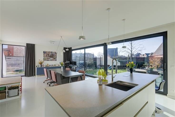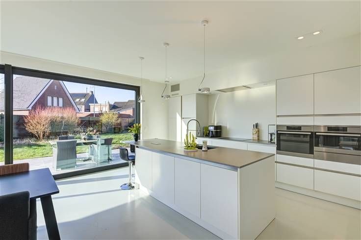 We komen binnen via de inkomhal die aan de rechterzijde toegang geeft tot de burelen, die allen voorzien zijn van inbouwkasten. In de hal is een gastentoilet en berging en aanwezig. De leefruimte bestaat uit een zeer ruime lichtrijke leefkeuken met kookeiland en een knusse zithoek, waar de gashaard voor nog wat extra gezelligheid kan zorgen. Vanuit de leefkeuken is er toegang tot de volledig omheinde, zuidgerichte tuin.