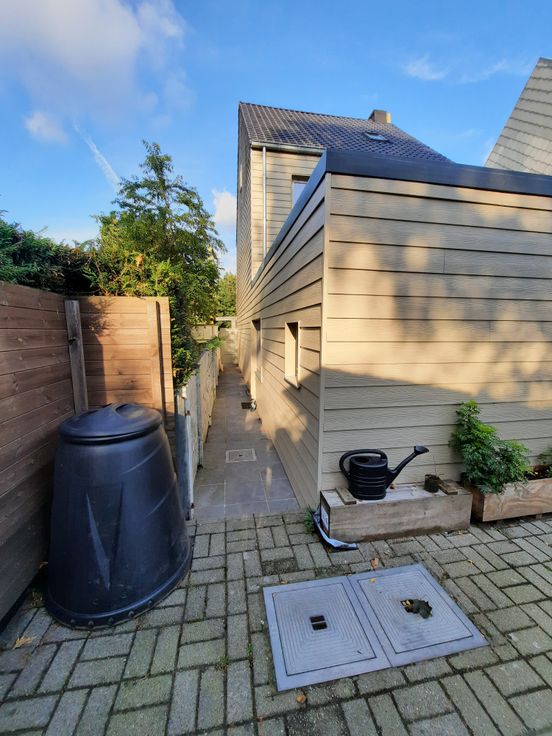 Terras, doorgang met poortje naast huis.