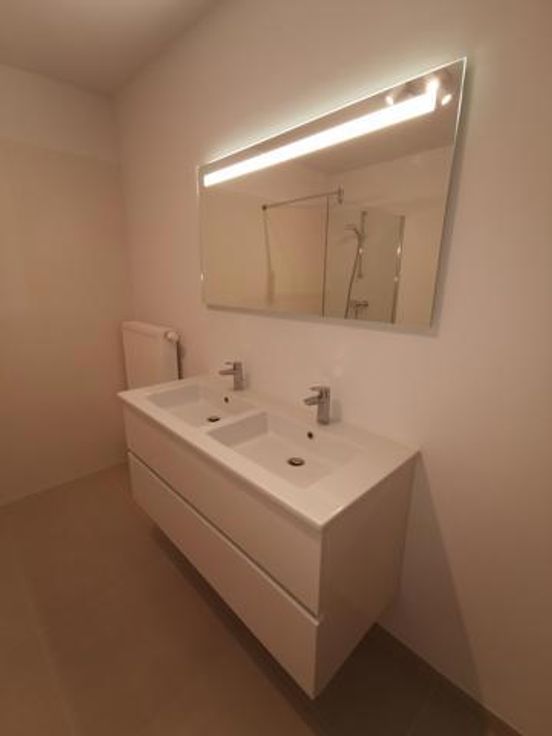 Dans un nouvel immeuble de huit appartements, proche du centre de Rebecq, IVA immobilière vous propose à la location cet agréable appartement de 90m². Il se compose d'un grand séjour avec cuisine ouverte donnant accès au balcon, deux chambres, une salle de bains (bain, douche italienne, double vasque), avec WC séparé et d'une buanderie. L'appartement est très lumineux et entièrement neuf avec des finitions de qualité. Chaudière privative au gaz et châssis PVC. EXCELLENT PEB A !!! Les charges communes s'élèvent à 60€/mois. Une place de parking et possibilité de disposer d'une place supplémentaire pour 60€/mois. Appartement idéal pour un couple avec un enfant. Libre le 5 Mai 2025 . Pour une visite contactez nous 02 850 03 63.