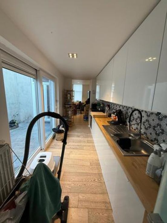 Deze charmante woning beschikt over een gezellige leefruimte en een volledig uitgeruste keuken met een oven, inductiekookplaat, dampkap en vaatwasser. Aansluitend aan de keuken bevindt zich een aangenaam terras.