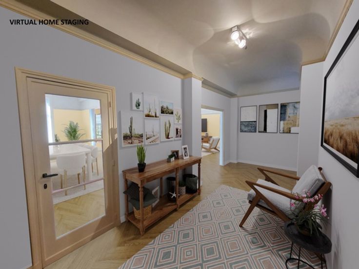 - aan de achterzijde: een gang (25 m²) die toegang geeft tot: a) keuken (20 m²), doorgang naar sanitair en dienstlift, b) slaapkamer 1 (13,50 m²), slaapkamer 2 (12,5 m²) met douchehoek en wastafel, slaapkamer 3 (18,30 m²) met directe toegang tot de badkamer (8,50 m²) met dubbele wastafel en bad/douche, slaapkamer 4 (15 m²).