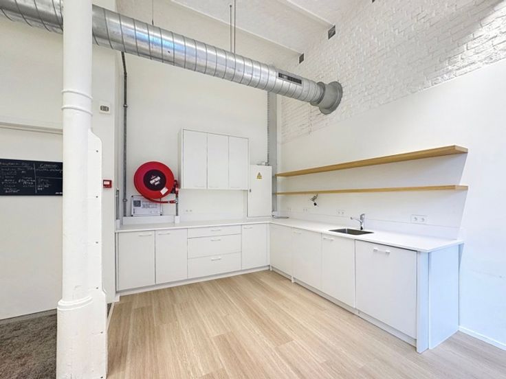 Praktisch gezien op de rechter begane grond (in het rood op bijgevoegd plan), 1 kantoorruimte van 188 m² waarvan 1 mezzanine in het oranje op het plan, 1 aparte ingerichte keuken met lunchtafel, 1 apart kantoor.