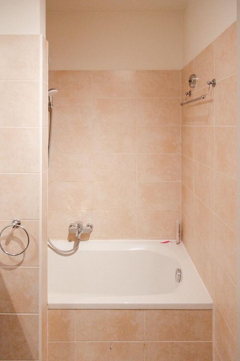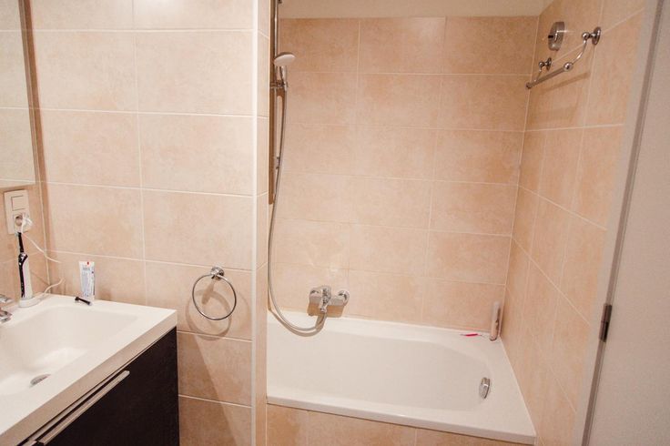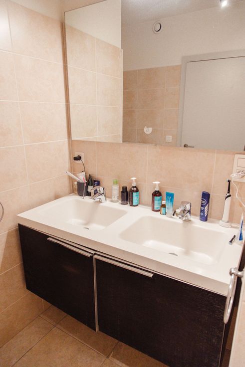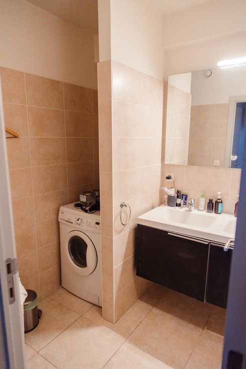 Een badkamer voor twee personen met wasmachine