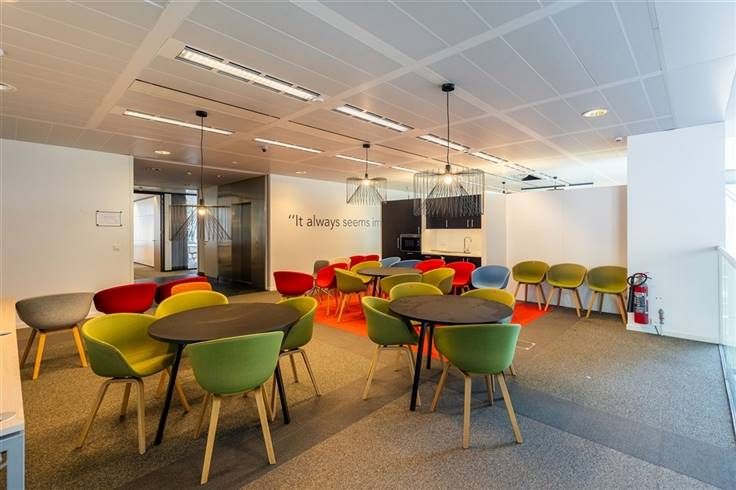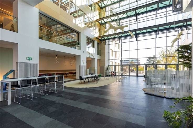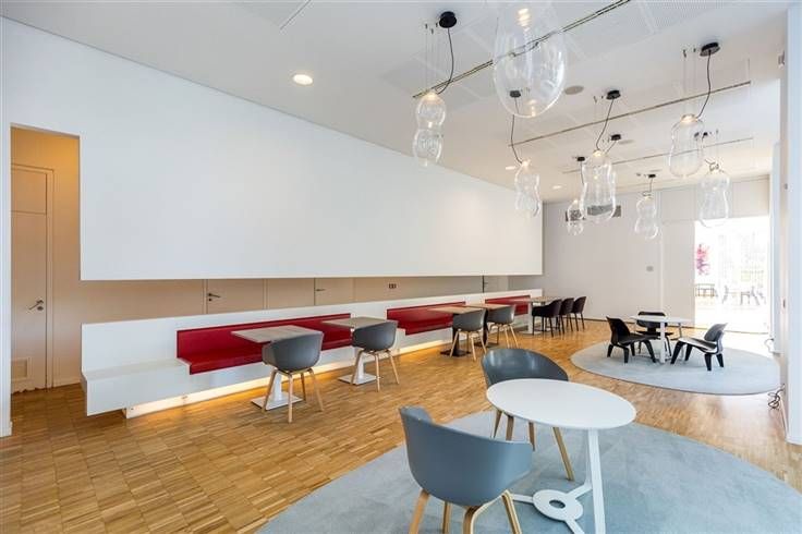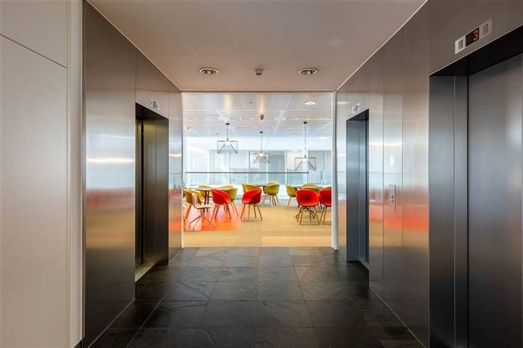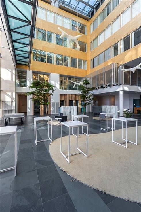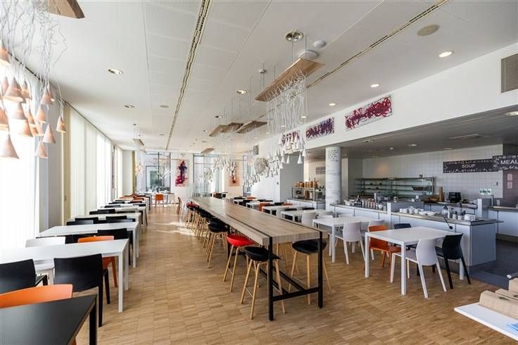 Er zijn gemeenschappelijke vergaderzalen op het gelijkvloers van het gebouw, evenals een bedrijfsrestaurant. Dit laatste heeft ook een buitenterras.