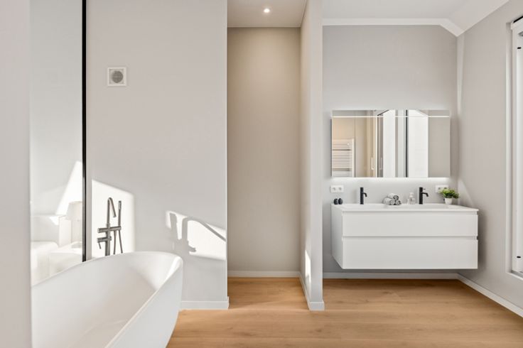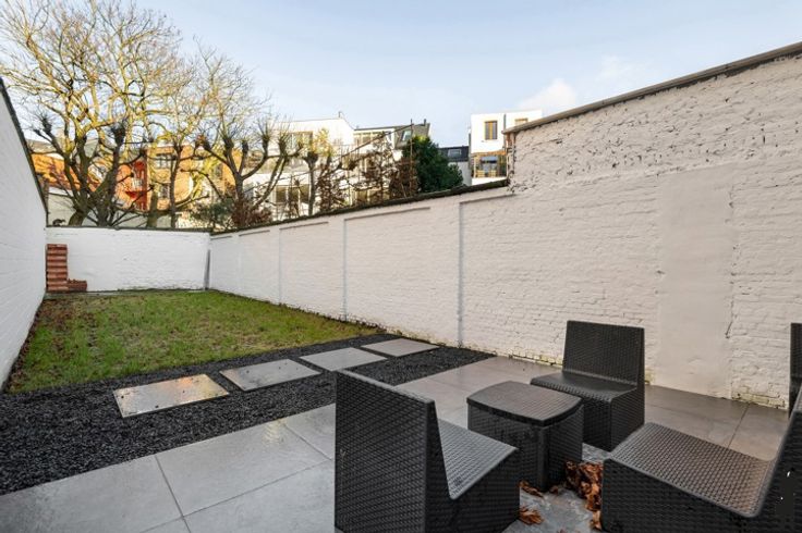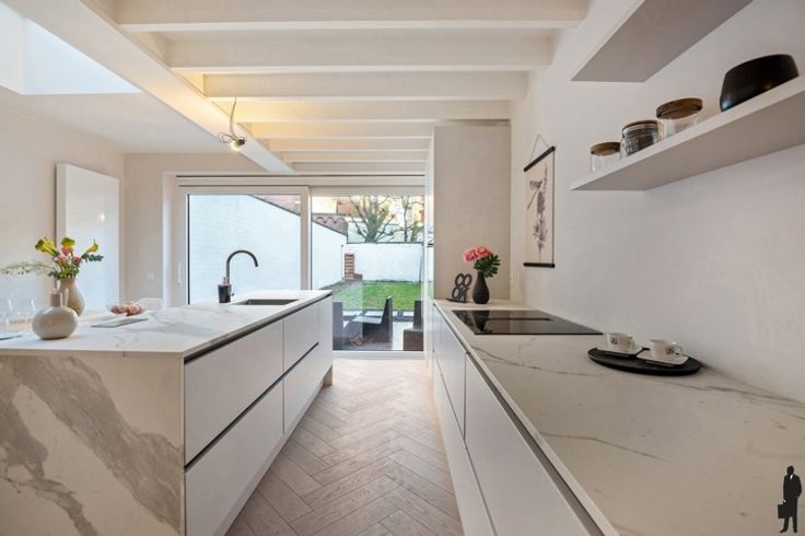 Luxueus afgewerkt herenhuis, opgedeeld in twee duplex appartementen, ideaal voor kangoeroewonen of als investering (wonen in één, verhuur van de ander). Beide appartementen zijn volledig gescheiden. Gelijkvloers en eerste verdieping: Dit appartement is afgewerkt met hoogwaardige materialen en biedt een open leefruimte met visgraatparket. De leefruimte heeft toegang tot een tuin van 85 m², waar het toegestaan is om een veranda te plaatsen. Het appartement is energiezuinig met EPC A en ventilatiesysteem C. Er zijn drie slaapkamers, elk met een eigen ensuite badkamer. Indeling gelijkvloers: Open leefruimte met volledig uitgeruste keuken en kookeiland Aparte berging en toilet Slaapkamer met ensuite badkamer Toegang tot ruime tuin met uitzicht op de Sint-Michielskerk Indeling eerste verdieping: Master bedroom met luxueuze badkamer, bad en aparte toilet Ruimte voor aansluiting wasmachine en droogkast Derde slaapkamer met ensuite badkamer (inloopdouche) Terras van 15 m² Tweede en derde verdieping: De tweede duplex biedt een lichtrijke leefruimte met een volledig uitgeruste keuken. Het terras biedt uitzicht op de Sint-Michielskerk. Er is een tweede slaapkamer met ensuite badkamer, ideaal voor gasten of als thuiskantoor. De master bedroom heeft ingebouwde kasten, een badkamer en een terras. Bijzonderheden: EPC A, geen asbest, elektriciteit conform Zonnepanelen worden geïnstalleerd op het dak Aparte meters voor gas, elektriciteit en water Zeer ruime kelderberging van ca. 40 m²