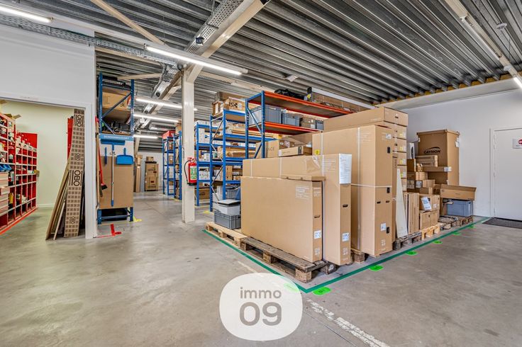 Het magazijn biedt dan weer voldoende ruimte voor de opslag van voorraad en materialen. Hoge plafonds, brede toegangsdeuren, alles is aanwezig om het laden en lossen van goederen vlotter te laten verlopen.