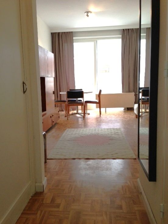 Inkomhal 4m2 met ruime ingemaakte kasten. Ruime lichte living 24m2 met leef- en slaapruimte. Hoge grote schuiframen (nieuw 2023) met veel lichtinval.