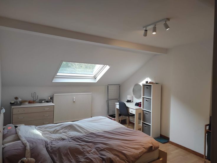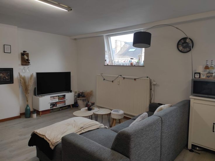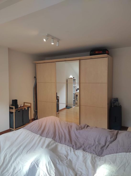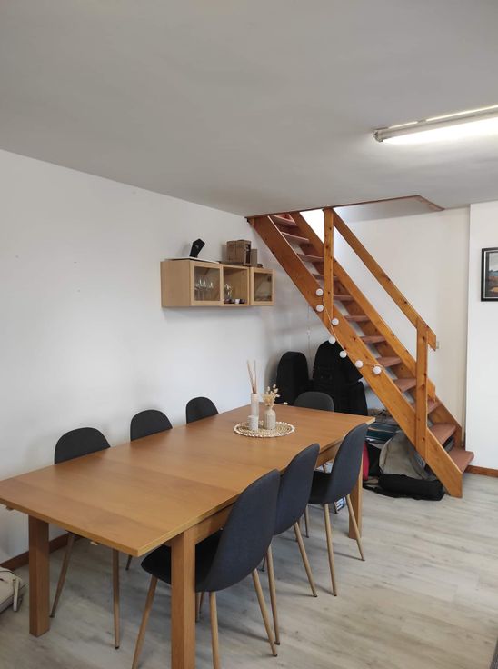 Le duplex comprend : au premier niveau : un grand living + cuisine équipée, une chambre à coucher, une salle de douche ; au deuxième niveau : un grand espace de bureau.