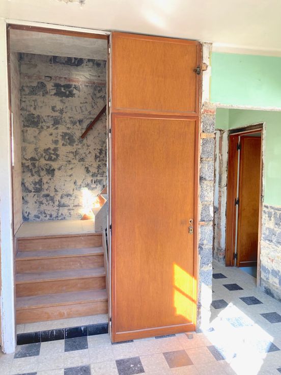 De bovenverdieping bestaat uit een ruime slaapkamer, een hal met ruimte voor een toilet en een grote open ruimte met dakkapel. De gelijkvloers werd gestript en dient verder vernieuwt te worden. De huidige indeling: inkom, lichte leefruimte, voorkamer, zijkamer, keuken, kelder, hal met toilet.
