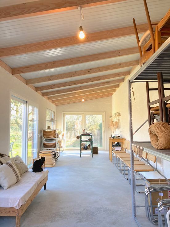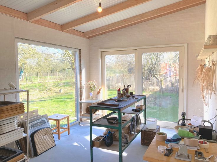 Het bijgebouw werd volledig vernieuwd en doet dienst als atelier. Deze lichtrijke en praktische ruimte is voorzien van elektriciteit, water en verwarming.