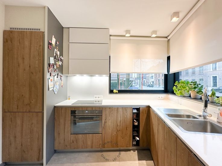 Daarna kom je in de open leefruimte met mooie eiken parket en een volledig uitgeruste keuken met toestellen.