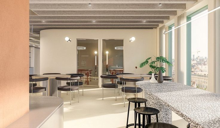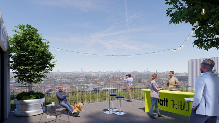 Specificaties: ingedeelde kantoorruimte met gemeenschappelijke keuken en sanitair H/D per verdieping, plafond met betonnen gewelven en open zoldering, opbouw led-armaturen, plafondkabelgoten, databekabeling, geothermische warmtepomp en betonkernactivatie, airco, breedband internet, toegangscontrole met badge Salto KS, 24/7 toegang, mogelijkheid tot publiciteit op totem, binnentuin en rooftopgarden, bovengrondse- en ondergrondse parking