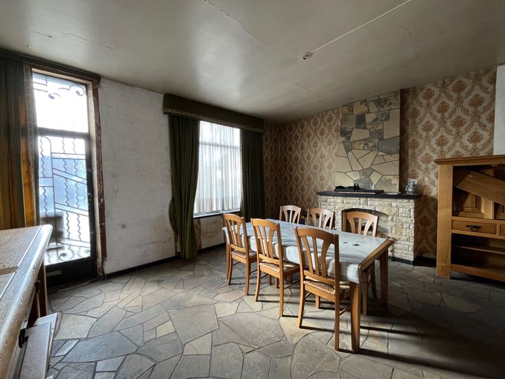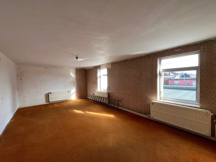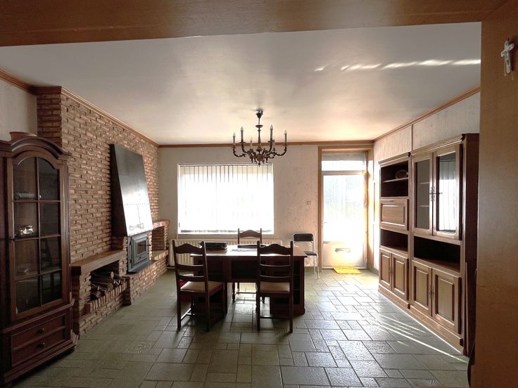 Maison attenante : +/- 110 m² habitable à rafraichir, comprenant un rez transformé en bureaux, à l’étage : deux chambres + salle de bains, un grenier et une cave. CC central au mazout.