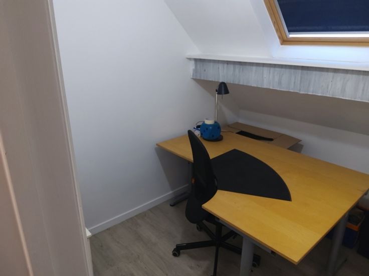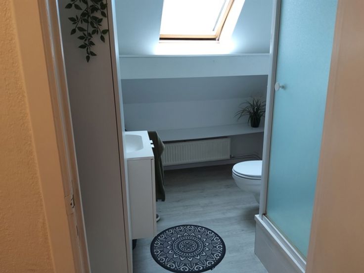 Het appartement beschikt over een gezellige living en een goed onderhouden keuken, uitgerust met een elektrische kookplaat, dampkap, koelkast en vaatwasser. Op het tweede verdiep bevinden zich de slaapkamer en een bureau, eveneens de badkamer welk voorzien is van een douche.