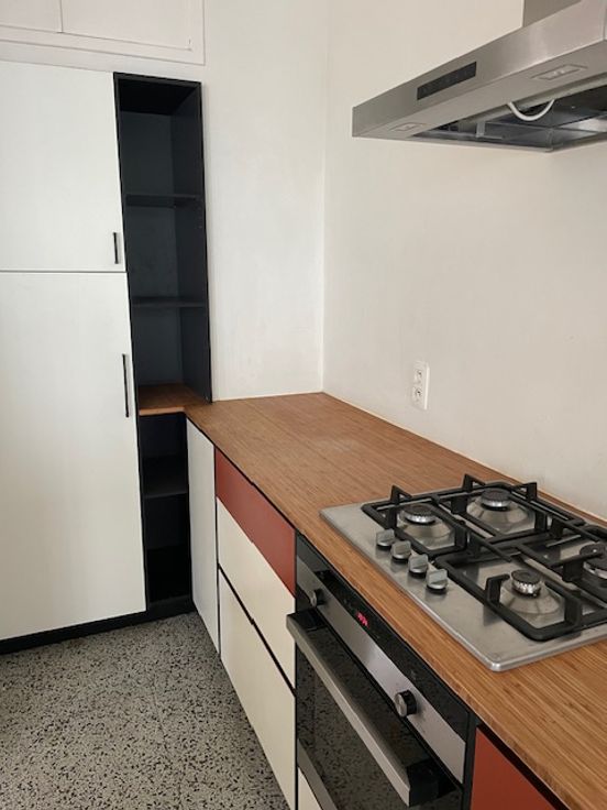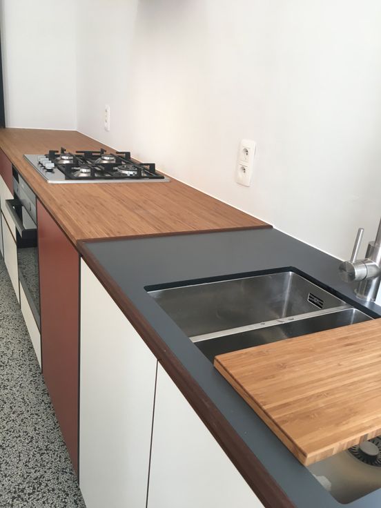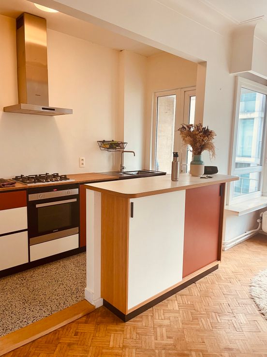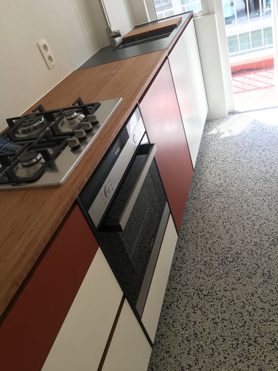 De keuken + toog is op maat gemaakt door een keukenbouwer en beschikt over een gasfornuis, dampkap, koelkast, vriezer en combi-oven. Er ligt een nieuwe terrazzo vloer. (Rozetta tiles) Door de erker en de vele ramen baden deze ruimtes in het zonlicht.
