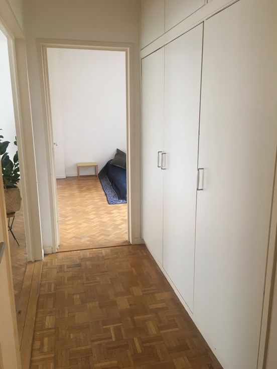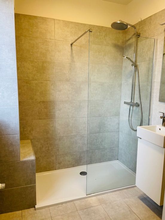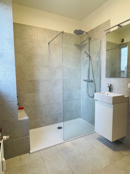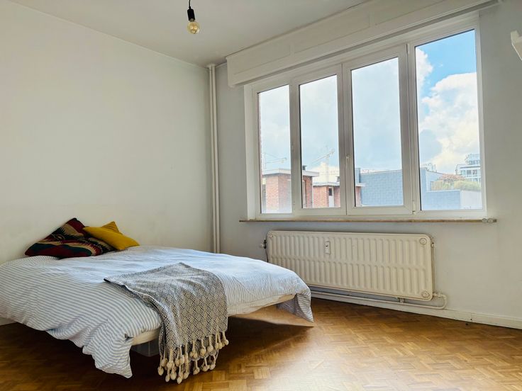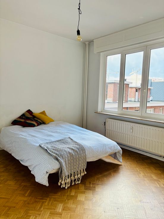 Achteraan bevindt zich 1 grote slaapkamer + een vernieuwde badkamer met inloopdouche (Grohe kranen) en wastafel + aansluitingen wasmachine en droogkast. Ook hier grote ramen in elke ruimte en dus veel licht.