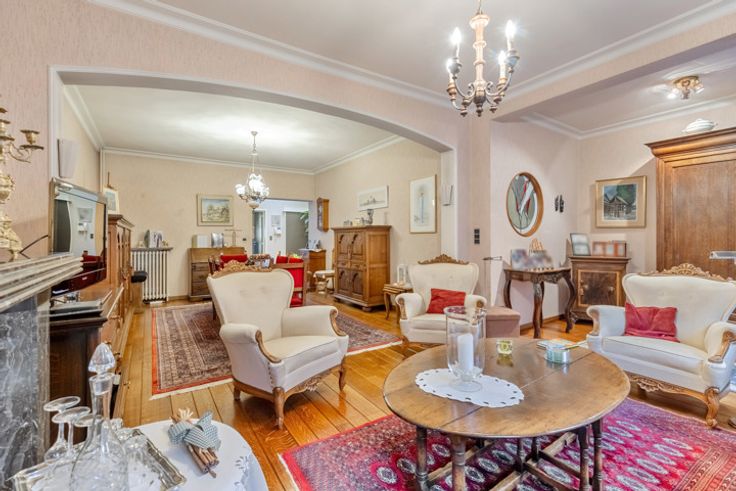ZEER RUIME (425M²) EN KARAKTERVOLLE WONING MET OP HET GELIJKVLOERS EEN OPPERVLAKTE VAN 126M² GESCHIKT VOOR VRIJ BEROEP EN OP DE VERDIEPINGEN EEN WONING MET 3 SLAAPKAMERS, VOORZIEN VAN DUBBEL GLAS, CENTRALE VERWARMING EN EEN TUINTJE, COMMERCIEEL GELEGEN IN HET CENTRUM OP 3A 15CA.