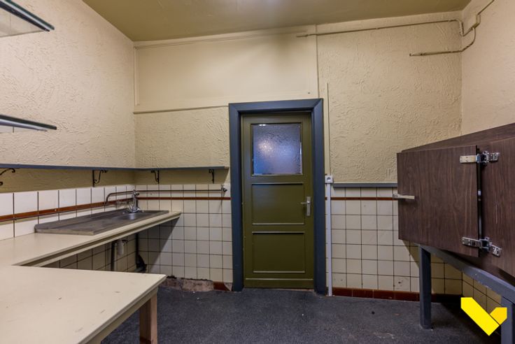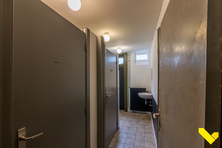 Op het gelijkvloers vinden we namelijk de consumptieruimte met een afgescheiden keuken/kitchenette. Achteraan het gebouw zijn sanitaire voorzieningen aanwezig.