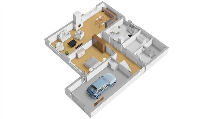 Rez-de-chaussée avec cuisine dînatoire de 8 m², grand salon et salle à manger lumineux de 40 m², chambre de 16 m², salle de douche avec WC de 8 m², WC séparé avec débarras, garage avec coin buanderie (26 m²).