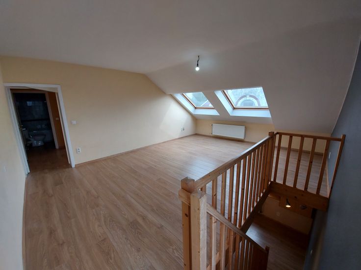 L'appartement est composé d'une toilette individuelle, d'une cuisine ouverte sur une pièce de vie, d'une autre pièce de vie à l'étage, d'une salle de douche et d'une chambre.