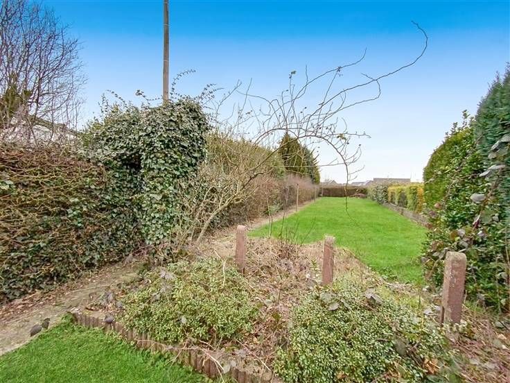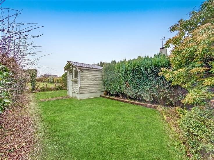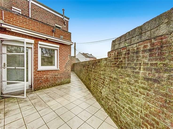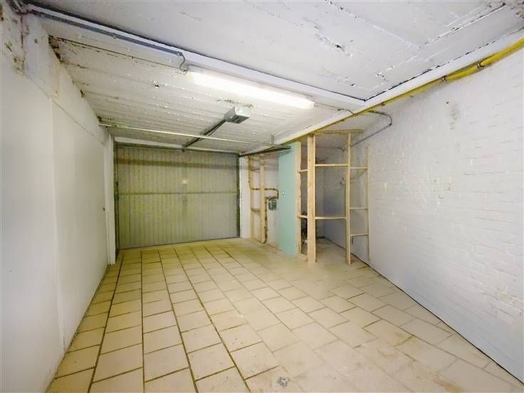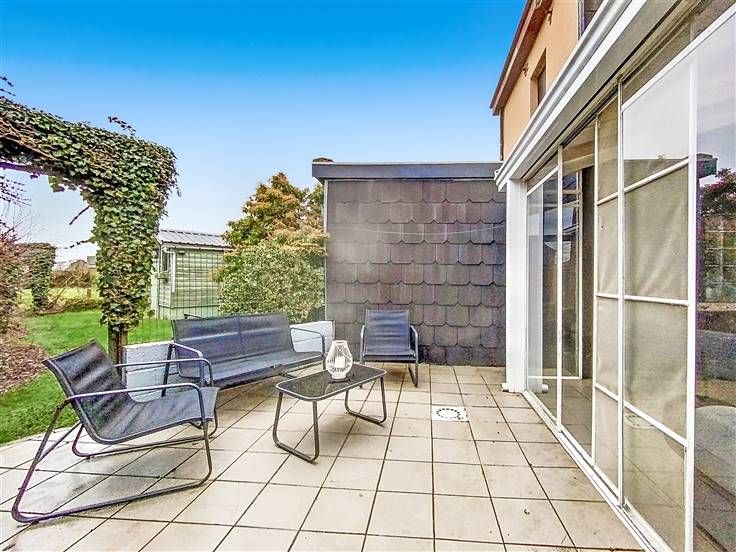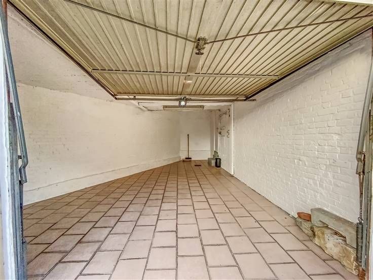 Grand garage, passage latéral, terrasse carrelée, débarras.