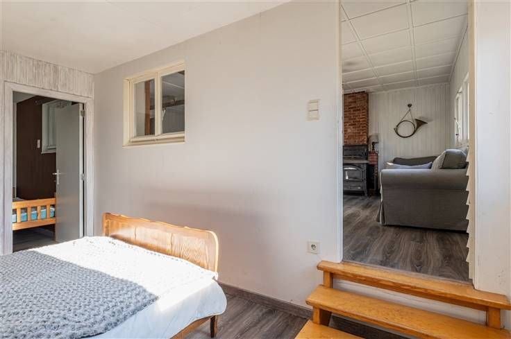 Het is gebouwd op een betonplaat van 30 cm en heeft een ruime lichte woonkamer met salon, eetkamer en open ingerichte keuken, 2 comfortabele slaapkamers, een doucheruimte en een wasruimte. Twee bijgebouwen maken het pand compleet: een garage en een tuinhuisje