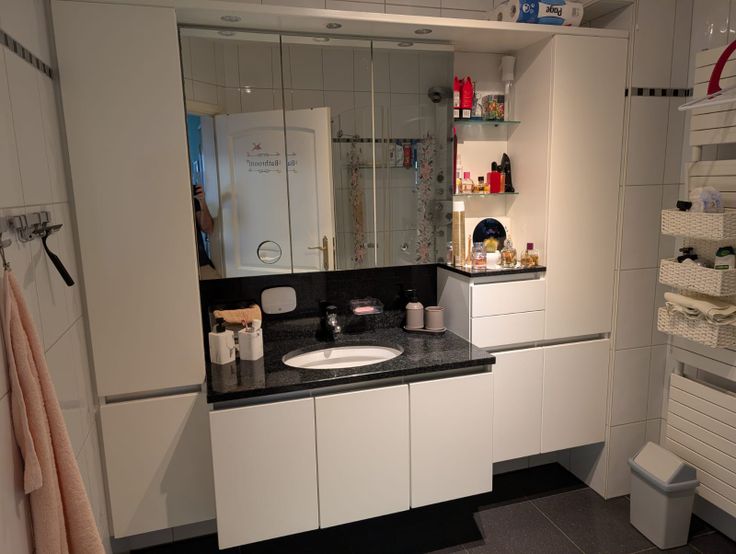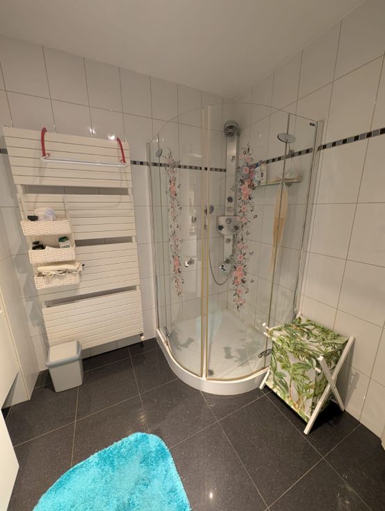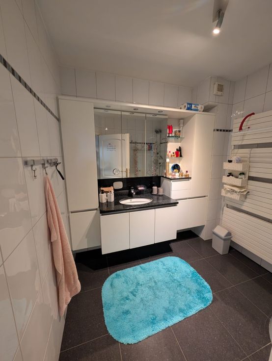 🚿 Moderne badkamer met lavabo, bergkasten en een douche.