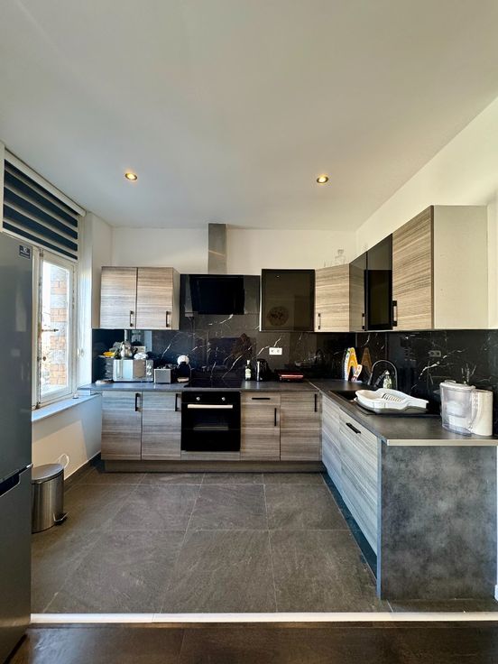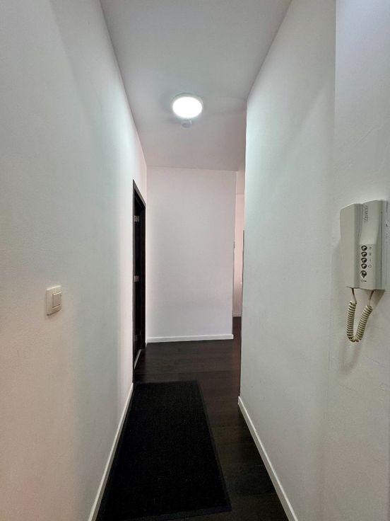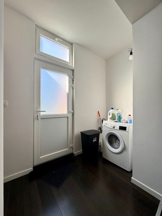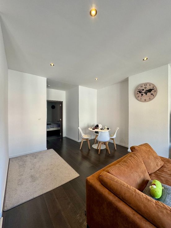 Na het binnenkomen bevindt zich achter de eerste deur een uitgeruste badkamer met douche, wastafel en toilet.Via de ruime gang kom je in de woonkamer , met eetruimte en open keuken.