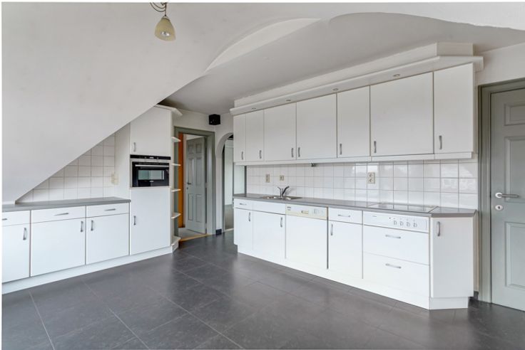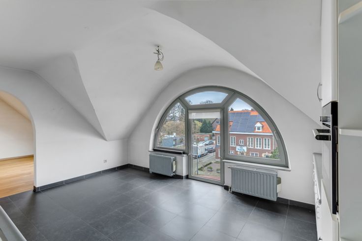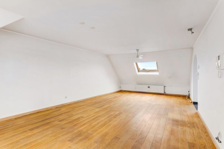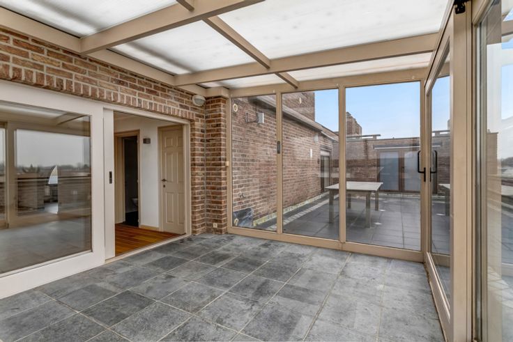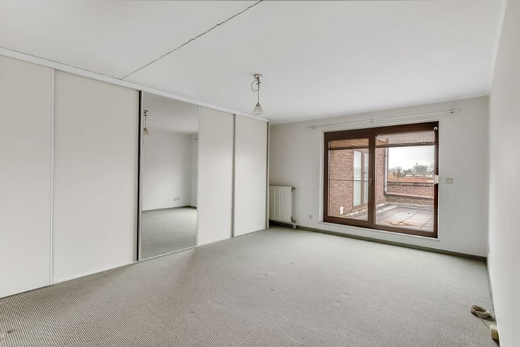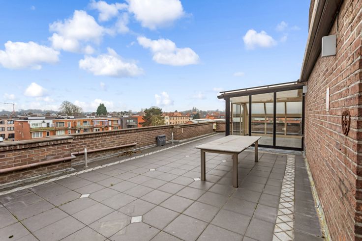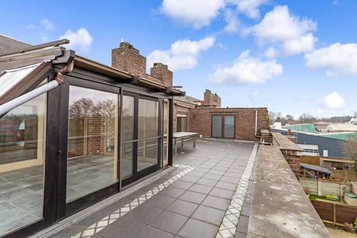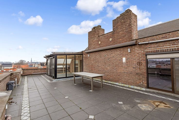 Goedgelegen dakappartement van ca 120 m² met 2 slaapkamers, zeer groot terras, zolder en twee garages.