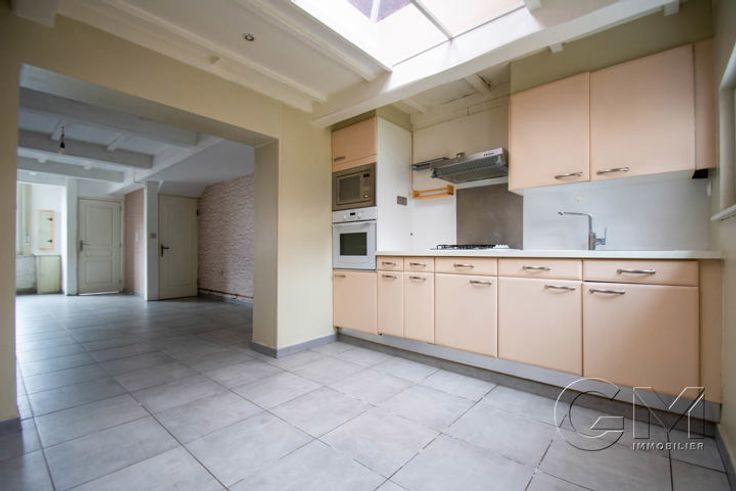 MOUSCRON Habitation 4 chambres, située dans une rue calme, avec grande terrasse et jardin, comprenant : * Au rez-de-chaussée : Hall d'entrée, séjour avec espaces salon et salle à manger, cuisine équipée (four, taque, hotte, évier, emplacement frigo et mobilier de rangement), salle de bain (baignoire/douche, meuble vasque et espace buanderie), chaufferie, WC séparé, petite cave, grande terrasse et jardin avec accès par l'arrière. * Au 1er étage : Hall de nuit desservant 3 chambres dont une passante. * Au 2ème étage : Grand grenier aménagé en une 4ème chambre. * Particularités : Habitation 4 chambres, châssis PVC double vitrage avec persiennes, chauffage par convecteur gaz (radiateurs électriques dans les chambres), toiture et plateforme en parfait état, terrasse et jardin, PEB : F, faible RC : 388€ (possibilité de droits d'enregistrement réduits à 3% au lieu de 12,5% !!!)