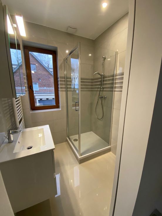 Hall d’entrée , cuisine équipée , salle à manger , salon , une chambre à coucher , salle de douche et toilette séparé .