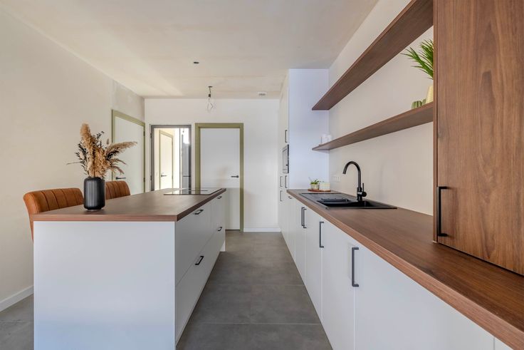 Bij binnenkomst word je verwelkomd in een ruime, lichtrijke hal met een bureauhoek en een apart gastentoilet. De open keuken met modern kookeiland is uitgerust met een koelkast, vriezer, combi-oven, dubbele spoelbak, vaatwas en kookvuur. Aansluitend bevindt zich een praktische berging. De ruime leefruimte geniet van overvloedig natuurlijk licht en biedt een aangename sfeer.