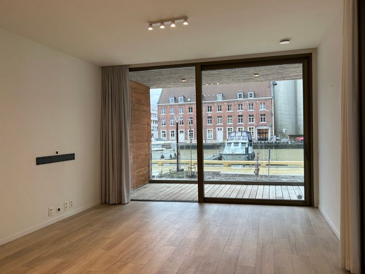 We vinden dit prachtig appartement terug aan de Vaartkom in Leuven, met zicht op de Dijle. Als we het appartement betreden, komen we in de inkomhal met handige, ingemaakte kasten. Van hieruit nemen we de trap (slechts enkele treden) en komen we in de ruime woonkamer met open keuken (30 m²). De keuken is uitgerust met een inductiekookplaat, een oven, een microgolf, een afwasmachine, een koelkast en een wasbak. Je hebt een prachtig zicht op de Dijle vanuit deze leefruimte. Een leuk pluspunt aan dit appartement zijn de hoge plafonds.