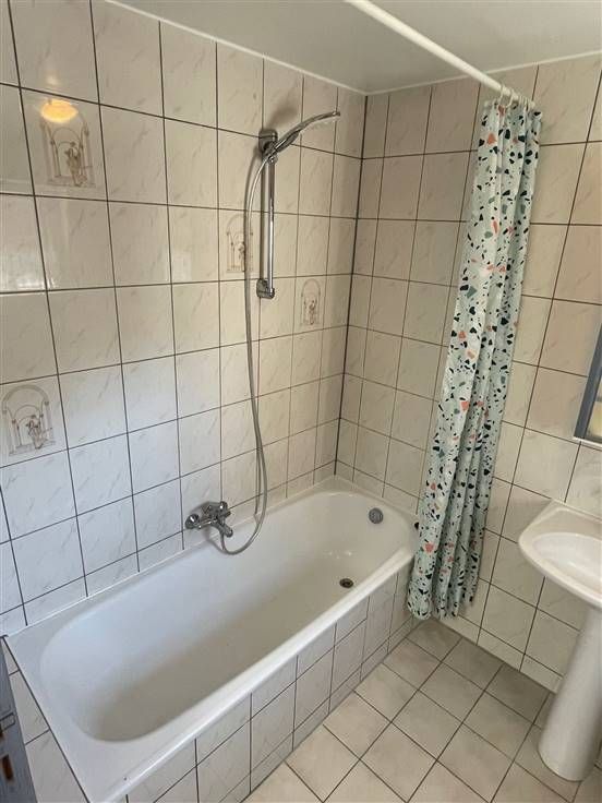 1 er étage : Palier de distribution, 1 chambre de +/- 15m², toilette séparée, salle de bain de +/- 4m² équipée d'une baignoire avec douche et d'un meuble lavabo.