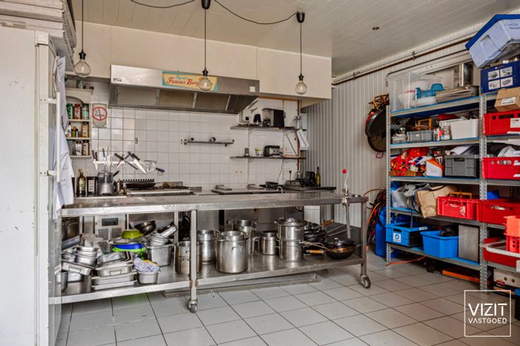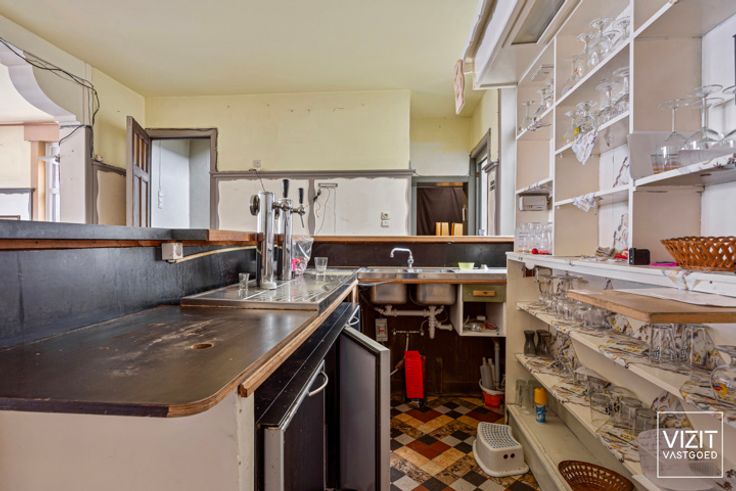 Dit handelshuis, momenteel ingericht als café 'De Groeneweg', biedt ruime mogelijkheden voor commerciële activiteiten. De indeling op het gelijkvloers omvat een café/commerciële ruimte (41 m²), een keuken (9 m²), een berging (7 m²), toiletten (16 m²) en twee garages (elk 43 m²) die momenteel zijn ingericht als zaal.