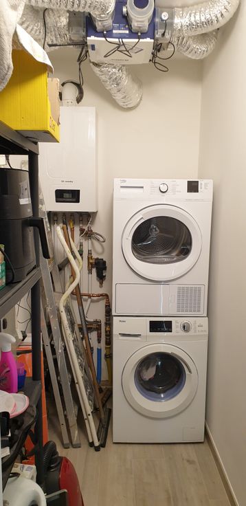 Extra comfort met o.a. parkettegels met vloerverwarming aangestuurd via een condensatieketel Vaillant in alle woonruimtes, automatisch ventilatiesysteem, schuifraam met grote glaspartijen, thermische beglazing, etc…kortom, maximaal comfort en lage verbruikskosten gegarandeerd!