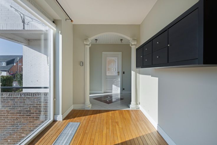 Via de inkomhal met grote vestiare komen we in de gezellige woonkamer, die is voorzien van parket en is opgedeeld in een zithoek en een eethoek. De grote raampartijen zorgen voor veel natuurlijke lichtinval. Verder vinden we de keuken, uitgerust met een vaatwasser, oven, kookplaat, afzuigkap, spoeltafel en voldoende opbergruimte. Naast de keuken is er een wasberging met inbouwkasten, een aansluiting voor de wasmachine en een douche. Als extra troef is er de veranda, die een prachtig uitzicht biedt over de tuin met zwembad.