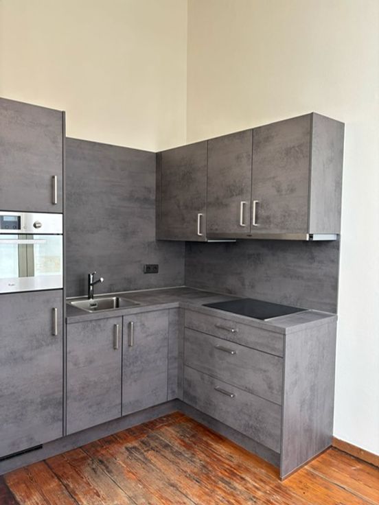 Een nieuwe keuken met nieuwe toestellen: frigo met vriesvak, kookplaat met dampkap, en combi oven.