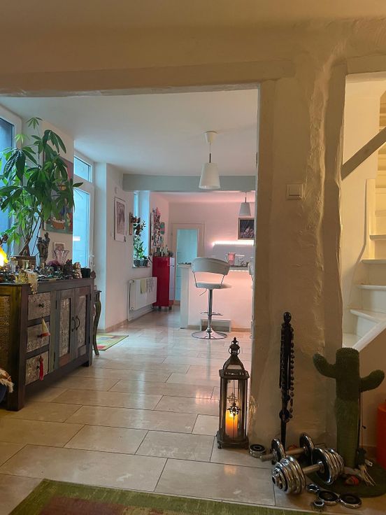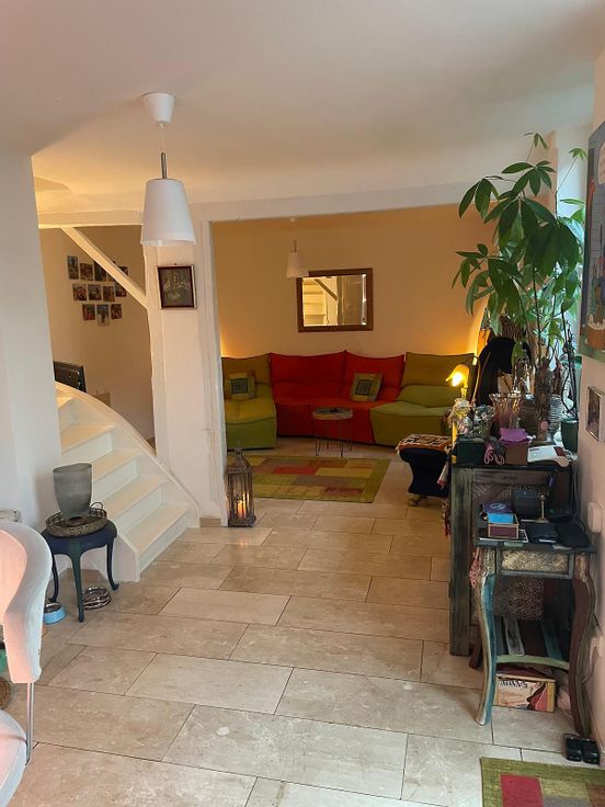 The semi-detached house is equipped with tiled and laminate floors, a fireplace, new PVC windows with double glazing, a fitted kitchen as good as new, modern oil heating, a cellar room, use of the garden and a roof terrace. A communal garage for bicycles is also available.In addition, there is a separate storage room with access via the garden and a car parking space in the courtyard.