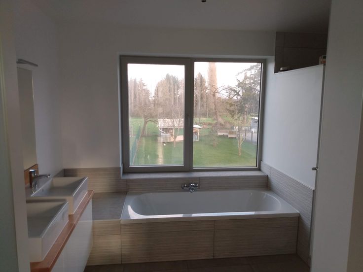 Een badkamer met een bad en een douche. Een dubbele lavabo.